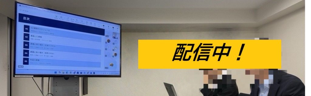 コムニックとグループ会社のトラスティア社の新人がOJT期間の振り返りを発表する会であり、その様子は、社内にオンライン配信され毎年100名以上の社員が参加しています。